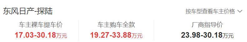 比如东风日产就豁出去了!旗下的中大型SUV——探陆拿出了很大的“诚意”。该车售价23.98-30.18万元,车主提车价为17.03万元起,标配车型的价格优惠了6.95万元,优惠力度并不小。