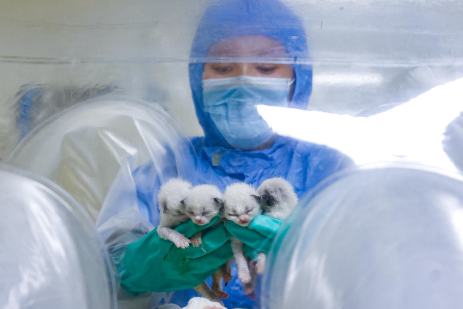 在无菌实验室里,几只刚刚满月的小猫咪闭着眼睛挤在一起,科研人员正小心翼翼地给“毛孩子”喂奶……这四只小猫咪,正是刚刚发布的全球首例“超洁净猫”。
