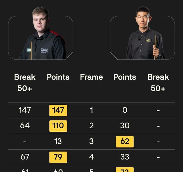 北京时间2025年9月15日刚刚结束的世界斯诺克英格兰公开赛第二轮比赛中,爱尔兰选手阿伦希尔单杆打出147分、64分、67分、61分、72分的表现以4-2险胜中国选手姚鹏成。